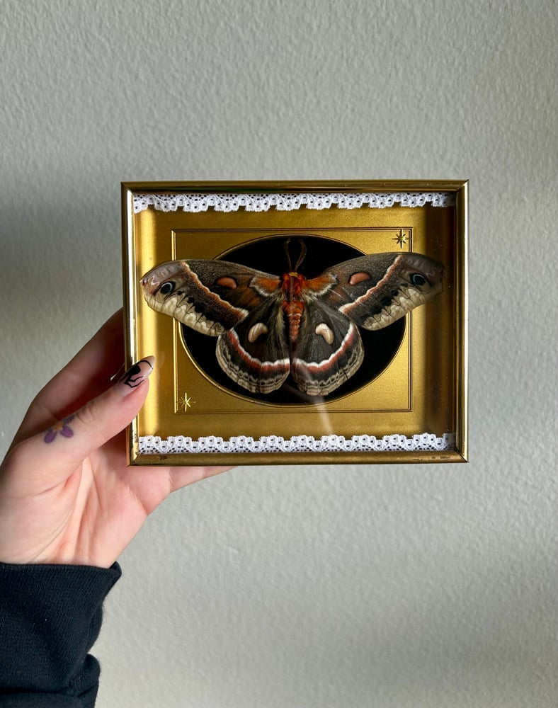 A Cecropia moth pinned and mounted in a 5’ by 6’ inch vintage shadow box frame *Vintage shadow boxes are not in perfect condition due to age*